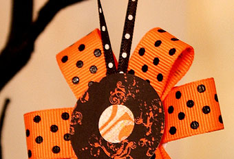 - kawałek czarnego materiału w białe kropki i ozdobna pomarańczowa taśma,