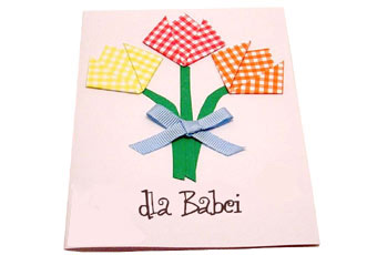 Wycinamy łodyżki, naklejamy je na kartkę. Doklejamy do nich kwiatki, Zawiązujemy i przyklejamy kokardkę. W środku wpisujemy życzenia.