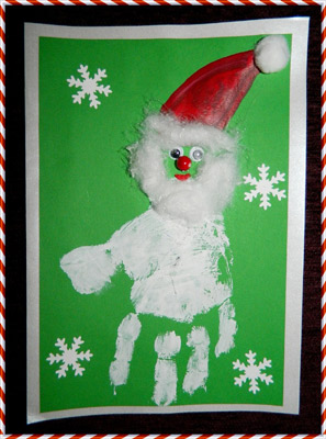 Mama Kamilka napisała: Ten portret postał poprzez pomalowanie rączki na kolor biały ( malował braciszek Kamilka Piotruś) ,następnie odbito rączkę na zielonym kartonie.Synek klejem magikiem przykleił oczka,nosek i buzie Mikołajowi.Broda powstała z waty :)Gwiazdki wyciął dziurkaczem ozdobnym.
