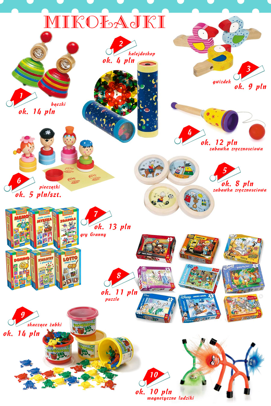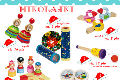 Pomimo tego, że przedszkolne budżety na paczki świąteczne są z reguły dość skromne, 15-20 zł na osobę, zawsze możemy znaleźć ładny i wartościowy upominek. Kupujmy przedmioty estetyczne, wykonane z przyjaznych materiałów, trwałe. Upominek może być niewielki, ale dobry jakościowo i po prostu mądry. Niech to nie będzie kolejny samochodzik dla chłopca i kolejna plastikowa lalka dla dziewczynki, ale przedmiot, który zaintryguje i na dłużej przyciągnie uwagę dziecka.